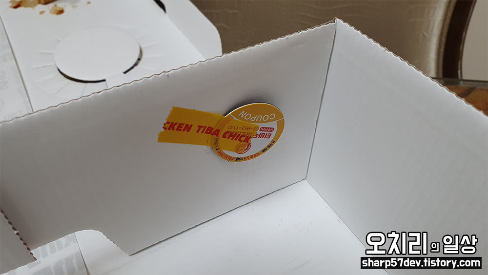 아! 그리고 쿠폰은 치킨상자 안쪽에 저렇게 붙여서 보내주시니
