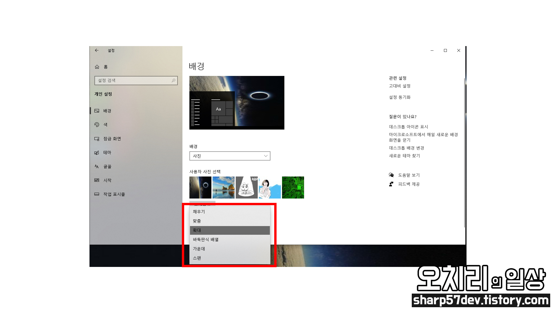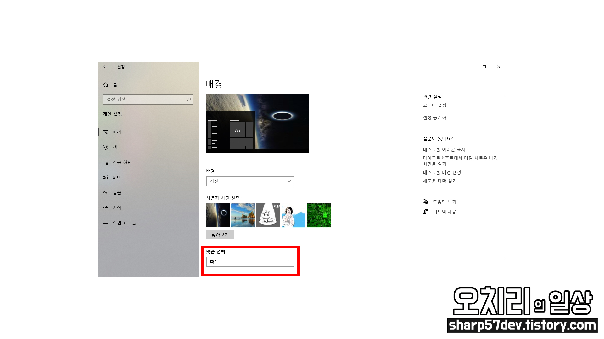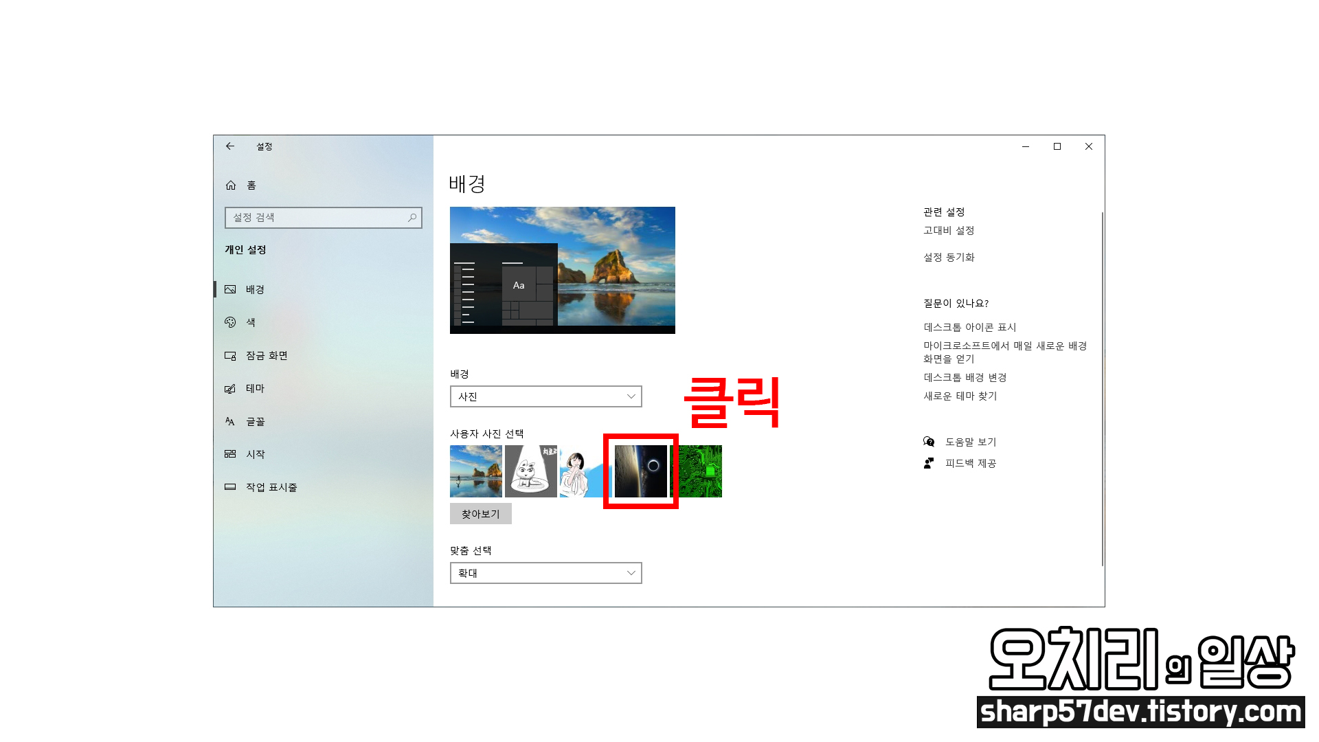 원하는 배경 이미지를 선택하고 "맞춤 선택"에서는 확대 메뉴를 선택했습니다.