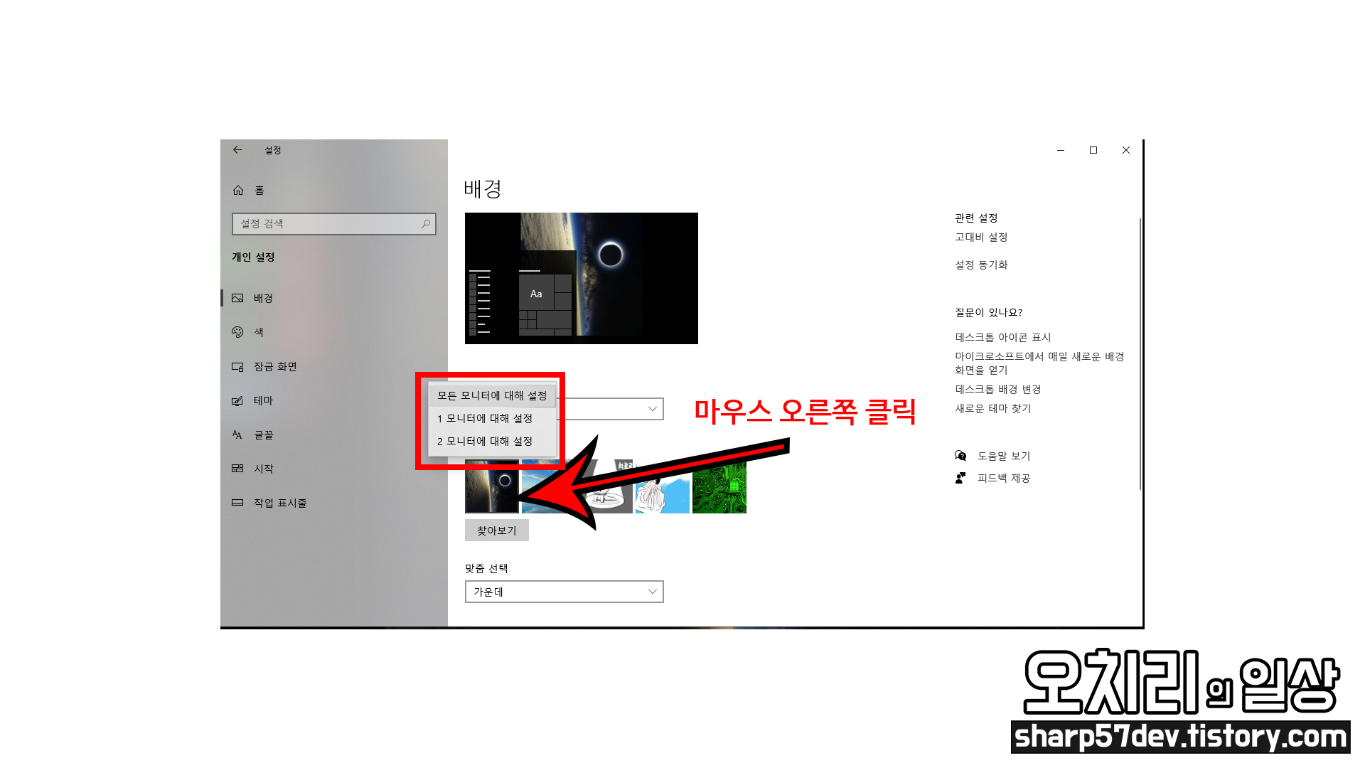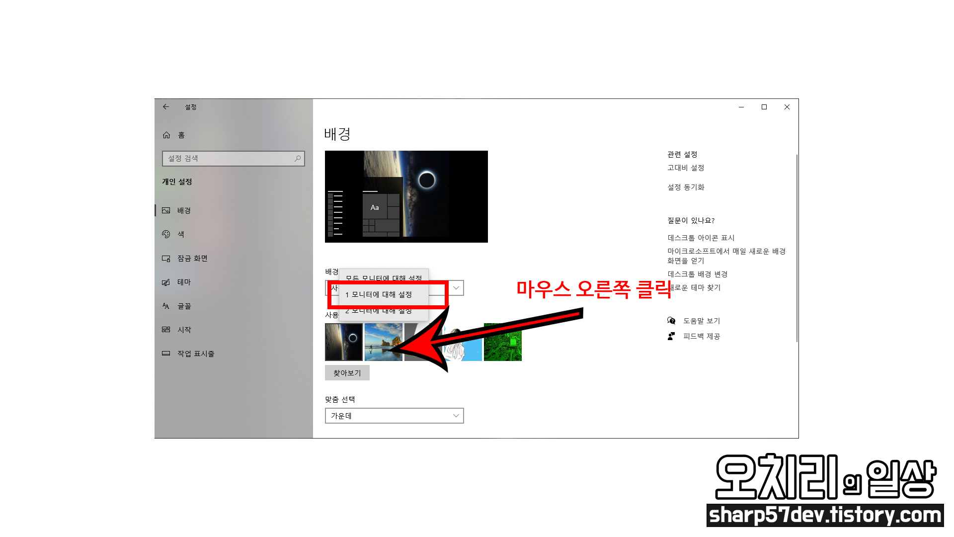 이번에는 다른 이미지를 선택하여 "1 모니터에 대해 설정"을 선택해 보았습니다.
