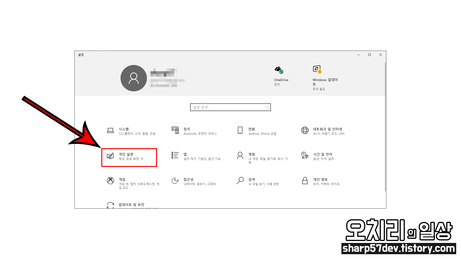 여기서 "배경" 메뉴를 설정할 수 있는 빨간 화살표가 가리키고 있는 "개인 설정" 메뉴를 클릭합니다.